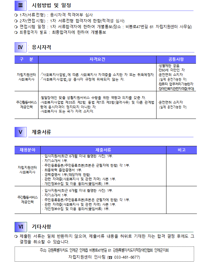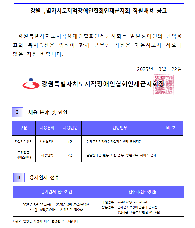 2025년 강원특별자치도 지적장애인협회 인제군지회 직원 채용 공고