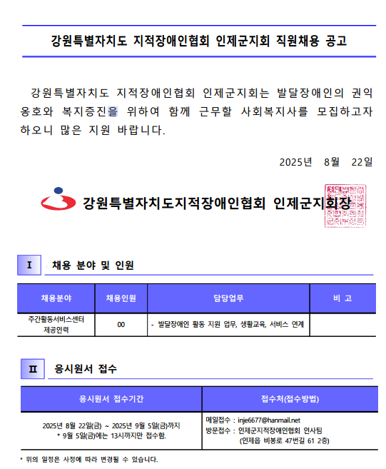 2025년 강원특별자치도 지적장애인협회 인제군지회 직원 채용 공고
