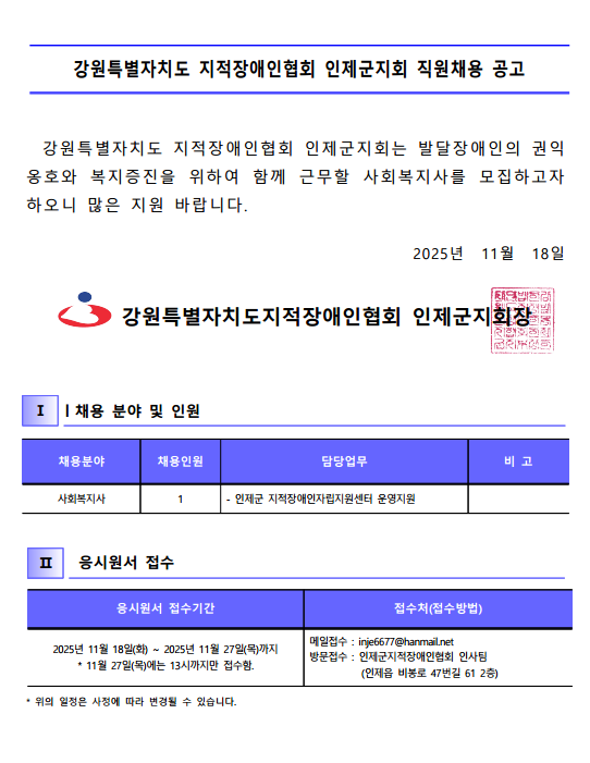 2025년 강원특별자치도 지적장애인협회 인제군지회 직원 채용 공고(자립지원센터)